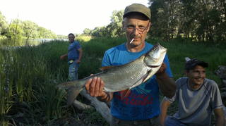 А еще до всего этого, когда только переносил вещи из машины на берег, мужик вываживал жереха и просил у  всех подсак. Оказалось что только у меня в машине только и был. Мужик не стал форсировать события чтоб я успел. Поймал он красавца минимум кила на два. А жерех все бил и бил никого не боясь метрах в 25 от того места где к тому времени собралось много ротозеев. Через несколько минут еще одного уговорил немного меньше размером. Потом сбежались все у кого были спиннинги и начали пулять все у кого что было, попперы,силиконы, колебалки и всякие воблеры. Вода также продолжала еще некоторое время бурлить от боя жережа но ловиться уже не хотел ни у того мужика ни у остальной толпы. Позже котел переместился немного ниже по течению и продолжал лупасить до самого темна. Мужик охотно согласился на фотосесию. Ловил он на Воблер Megabass Dog-X Jr.Coayu 71F