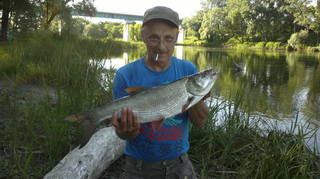 Рыбалка началась с поимки нескольких ершей носарей довольно крупных размеров, которые отправлялись назад в реку. Попадалась и плотва с красноперкой. В 7 часов аж сердце екнуло, когда увидел долгожданную серию потяжек и отстрел вершинки фидера. С первых секунд борьбы я понял, что это та рыбка, за которой я приехал. Лещ не резко, но упорно давил и сопротивлялся. Трудности создал еще и топкий берег, подсак с короткой, 2х метровой ручкой не позволял комфортно принять рыбку на борт. Ну ничего, как-то справился. Лещ лежит передо мной в подсаке, радости полные штаны!!! Ищу телефон по карманам для пижонской фотосессии..... и тут лещ так трепухнулся, что выскочил из подсака. Я, как завороженный наблюдаю картину, как он оказывается на топком берегу, прихожу в себя, за ним, но уже поздно. Рыба даже постояла несколько секунд, как бы издеваясь, сделала брызги хвостом и ушла.. Короче, откровенно прое...л я свое счастье. Несколько минут воспитательной беседы с самим собой на берегу, могли бы показаться стороннему наблюдателю острым приступом кризиса шизофрении в агрессивной форме. Ну ничего, выдохнули, успокоились..