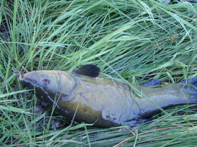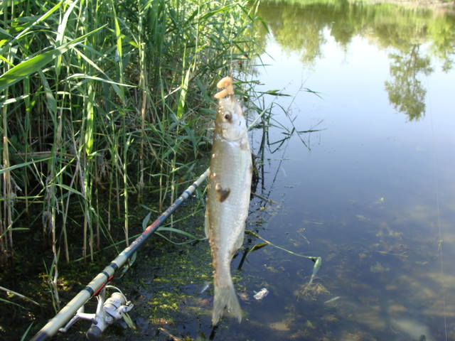 Потом начал оборудовал само место ловли где я должен был рыбачить. Потом, а что потом? Почему то подкосило здоровье, может от жары а может... Намешал прикормку не какую нибудь а браунинг, чего мелочиться, за лещом ведь приехал. Первая рыбка в виде очень большой уклейки появилась уже ближе к вечеру, потом начались поклевки плотвы и мелкой густеры и только в сумерках попался подлещик на пол кило. В надежде что просто тот был разведчик я просидел до 12-00 так ничего и не было приличного. С рассветом я замесил прикормку по круче фирмы Sensas- лещ. Думаете помогло? Мелочь ловилась исправно до последнего а леща так и не было. Что было приятно в этой рыбалке так это поплавочная удочка которая хоть кукую радость принесла в виде четырех не очень больших линей. Потянули на 1,5 кг общего веса. Может поймал бы еще но почему то два самых крупных сдохли в садке. Крючок что я применил видать маловат был для такой рыбы,приходилось извлекать экстрактором из глубины пасти, видать это и послужило скороспостижной их кончины. heh Шел уже девятый час а лещ так себя и не проявлял. В прошлом году именно днем он и ловился а тут ничего. Надежды не было на появление леща как не было надежды на улучшение моего здоровья. Решил собраться домой чтоб спасти линей, единственная радость от данной рыбалки. Про тот факт что там ловится линь мне рассказал тоже Сергей за что ему спасибо. Ничего не фотографировал  потому как сильно подкосило здоровье, так что простите.  ;(